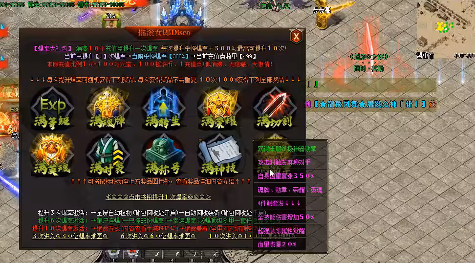 | 超级魔法药 | 恢复魔法值,保障法师、道士技能持续释放 | 250瓶 | 30000瓶 |