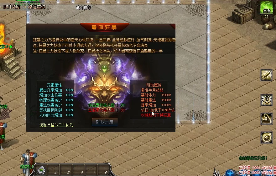30级解锁半月弯刀(战士第一个群攻技能)后,可前往石墓阵或祖玛寺庙一层练级。这两个地图的怪物密度适中,适合战士使用半月弯刀群体清怪。半月弯刀单次可攻击3-4只怪物,每只怪物可获得400-500点经验。此阶段战士血量与防御已有所提升,可正面抗伤,12-15小时可提升至40级。