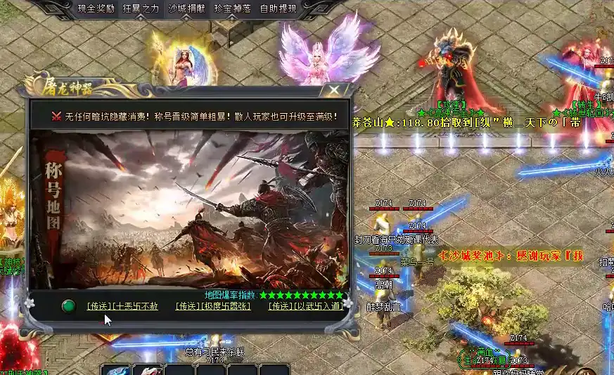 跨服活动场景:如乱斗沙漠,安全区范围动态缩小,需提前5分钟关注安全区变化提示,及时移动至新安全区;活动中避免单独行动,与行会成员组队聚集,利用人数优势抵御PK;携带绝对防御符、冰冻符等道具,遭遇围攻时使用道具脱困。