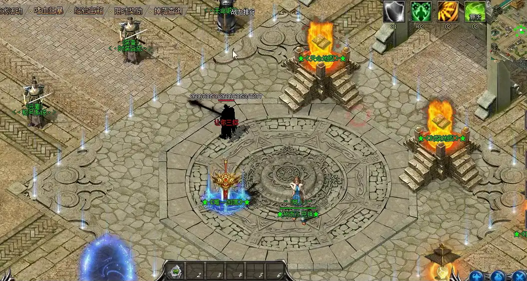 跨服活动场景:优先携带功能类道具(冰冻符、驱散符、绝对防御符)、大量补给药水,传送类道具仅携带小飞鞋,因活动地图内可能限制随机卷使用。