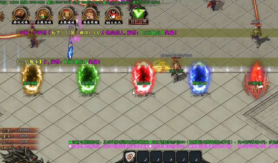 首充返利活动:新区开服时,官方通常会推出首充双倍、三倍活动,例如首充100元可获得2000元宝+2000VIP经验,相当于翻倍提升效率。部分版本首充还会额外赠送稀有道具,如黄金裁决、满阶天狼坐骑等,进一步提升充值性价比。