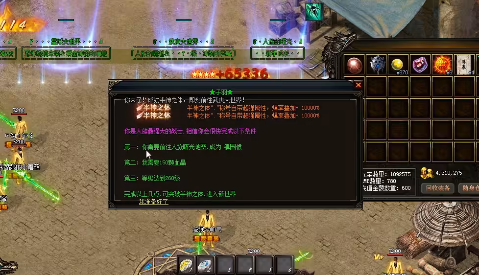 超变版本的装备更新速度快,收藏品类极为丰富,核心收藏目标为“攻速神器”“专属铭文”“终极宠物蛋”等。这类藏品多通过击杀超变BOSS(如“七彩龙王”“暗黑魔主”)掉落,或通过合成系统获取(如3个普通神器+5个补天神石合成终极神器)。超变版本的收藏门槛较低,新手玩家通过挂机也能获得基础藏品,但顶级藏品的获取难度依然极大,需要大量时间和资金投入。此外,超变版本的部分藏品带有“唯一性”标识,全服仅1件,如“全服第一战士”专属武器,成为土豪收藏家的专属目标。